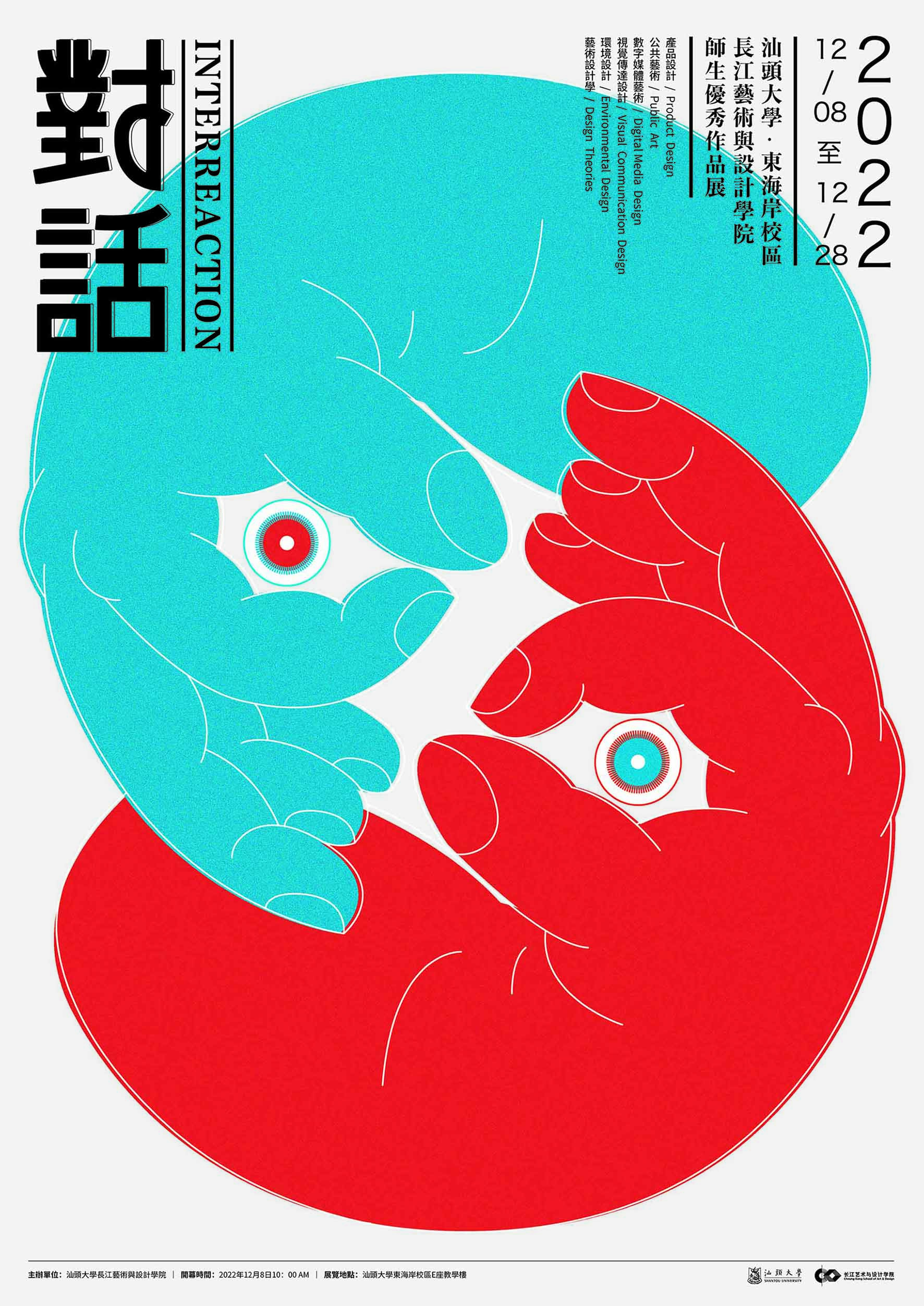 海报形象是为一主题为「对话」展览所做,以“眼”和“手”为元素:眼为思考,手为实践,设计便是思考与实践的对话。双眼双手呈太极之势,寓在两者对话中探索无限可能性。整体呈“S”之形,象征汕头大学英文简称“STU”。