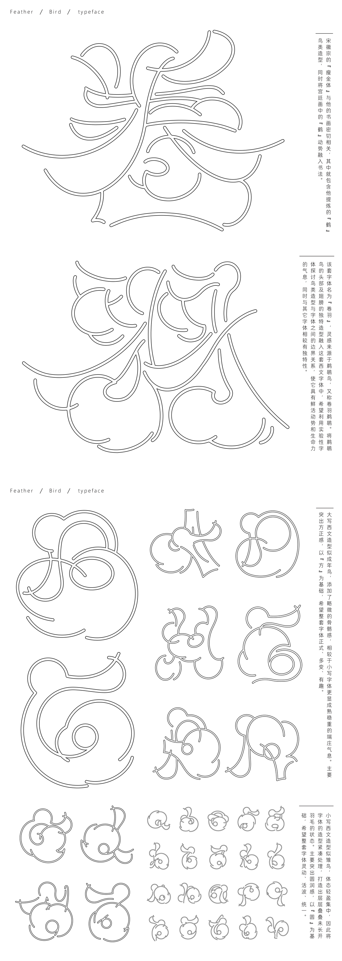 字体设计灵感来源于卷羽鹈鹕鸟,将鹈鹕鸟的头部及翅膀的独特造型融入字体设计实验中,希望利用实验性的字体探讨鸟类造型与字体之间的边界关系,尝试使它具有鲜活动势和生命力的气息。